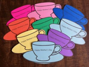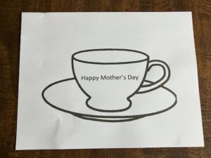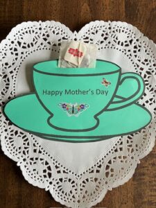 I found a free teacup template online and tweaked it for the preschool craft at my church. I added “Happy Mother’s Day” to the front of colored cardstock and cut a slit in the top of the cup for a teabag. Butterfly stickers completed the project. It’s so cute! I’m thinking about doing a teapot next year for Mother’s Day.
